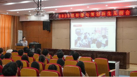 会议伊始,陈潇潇代表传播与策划专业所有教师,对2023级新生表示热烈欢迎。随后,她从“传播”、“策划”两个核心词出发,介绍传播与策划专业的人才培养模式、专业课程体系、教学环境、就业前景等,并结合近日火爆的“瑞幸+茅台”联名传播案例,分析传播与策划的现实应用和学习方法。她指出技术的日新月异推动着媒体媒介的不断革新,学生们要紧跟时代,汲取多方知识,学习各项技能,同时要兼顾自身特点,钻研擅长领域,成长为一专多能的“多面手”。