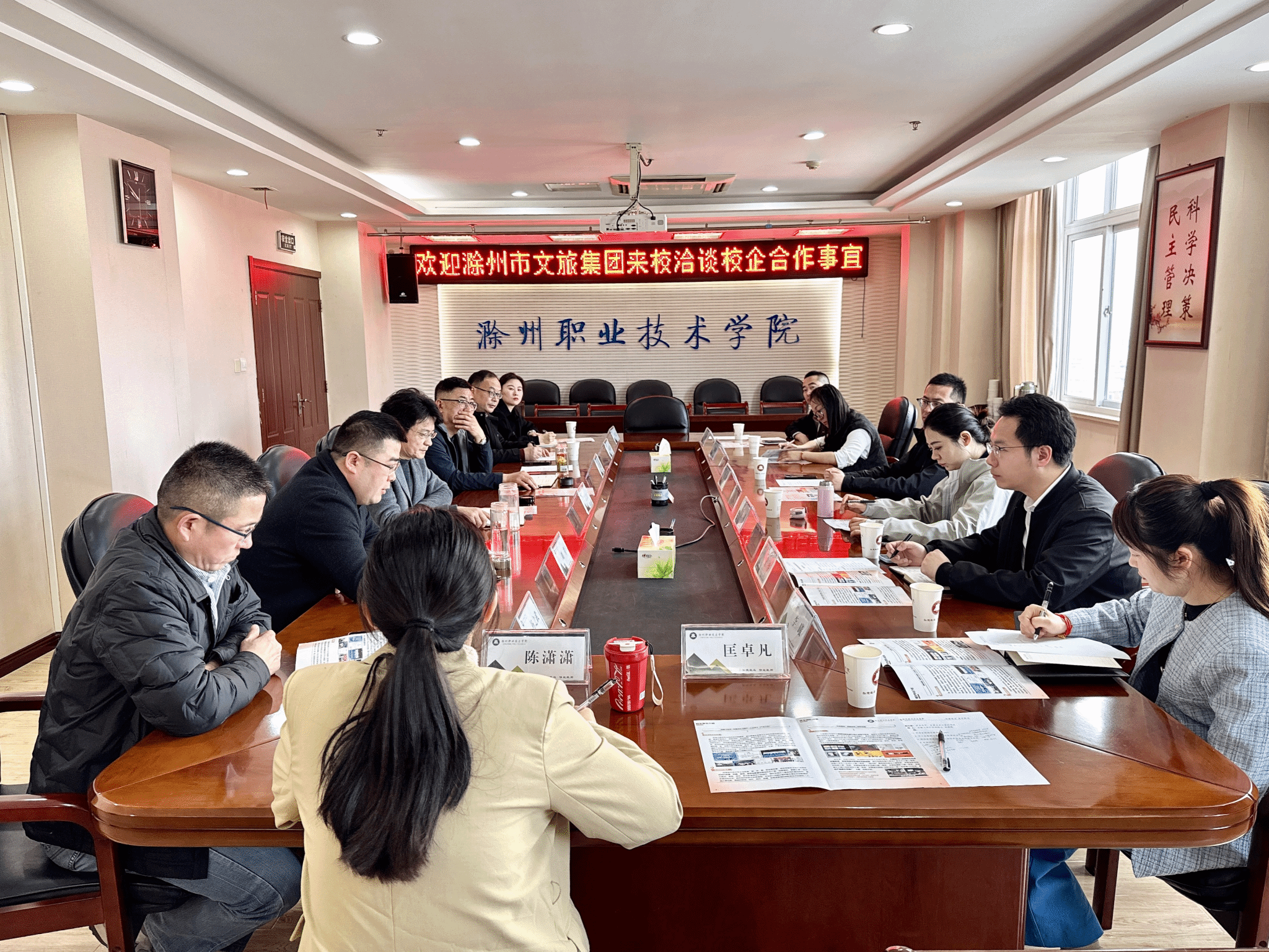 3月30日,市文旅集团党委委员、副总经理叶晨光,市文旅集团办公室主任王璐,市文旅集团品宣部职工黎琳君,市文旅开发公司总经理崔睿,市建安公司总经理杨帆,市旅游管理公司总经理李曦一行来校考察交流并洽谈合作事宜。校党委委员、副校长苏有良热情接待到访来宾,校长助理、招生就业处处长穆松出席会议,传媒与设计学院院长闻建强、科技处副处长刘青、传媒与设计学院副院长杨之武以及学院相关专业教师参加会议。