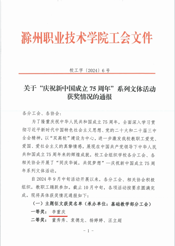在党的二十大和二十届三中全会精神的引领下,为隆重庆祝中华人民共和国成立75周年,全面深入学习贯彻习近平新时代中国特色社会主义思想,beat365以“双高校”建设为中心,积极组织开展了“同庆华诞,共筑梦想”——庆祝新中国成立75周年征文活动。传媒与设计学院设计艺术系党支部入党积极分子李重庆积极参与,其作品《沐浴祖国的春风——老李家的三代人》脱颖而出,荣获此次征文活动的一等奖。
