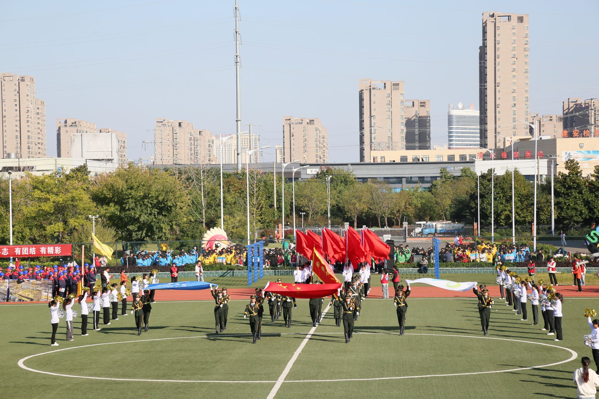 伴随着激昂的《运动员进行曲》,国旗护卫队、校旗会旗队、红旗方阵、裁判员方队、各教学院部师生代表队依次入场。各学院方阵队采用富含创意的设计,以其独特的风格展示学院风采,在表现积极进取精神面貌的同时,也体现出滁职青年奋楫争先的青春底色。入场仪式完毕后,全体肃立,高唱中华人民共和国国歌,注视着庄严的五星红旗冉冉升起。许雪峰在致辞中代表学校向悉心筹备本届运动会的师生员工表示诚挚的谢意,向全体运动员、裁判员致以亲切的问候和美好的祝愿。