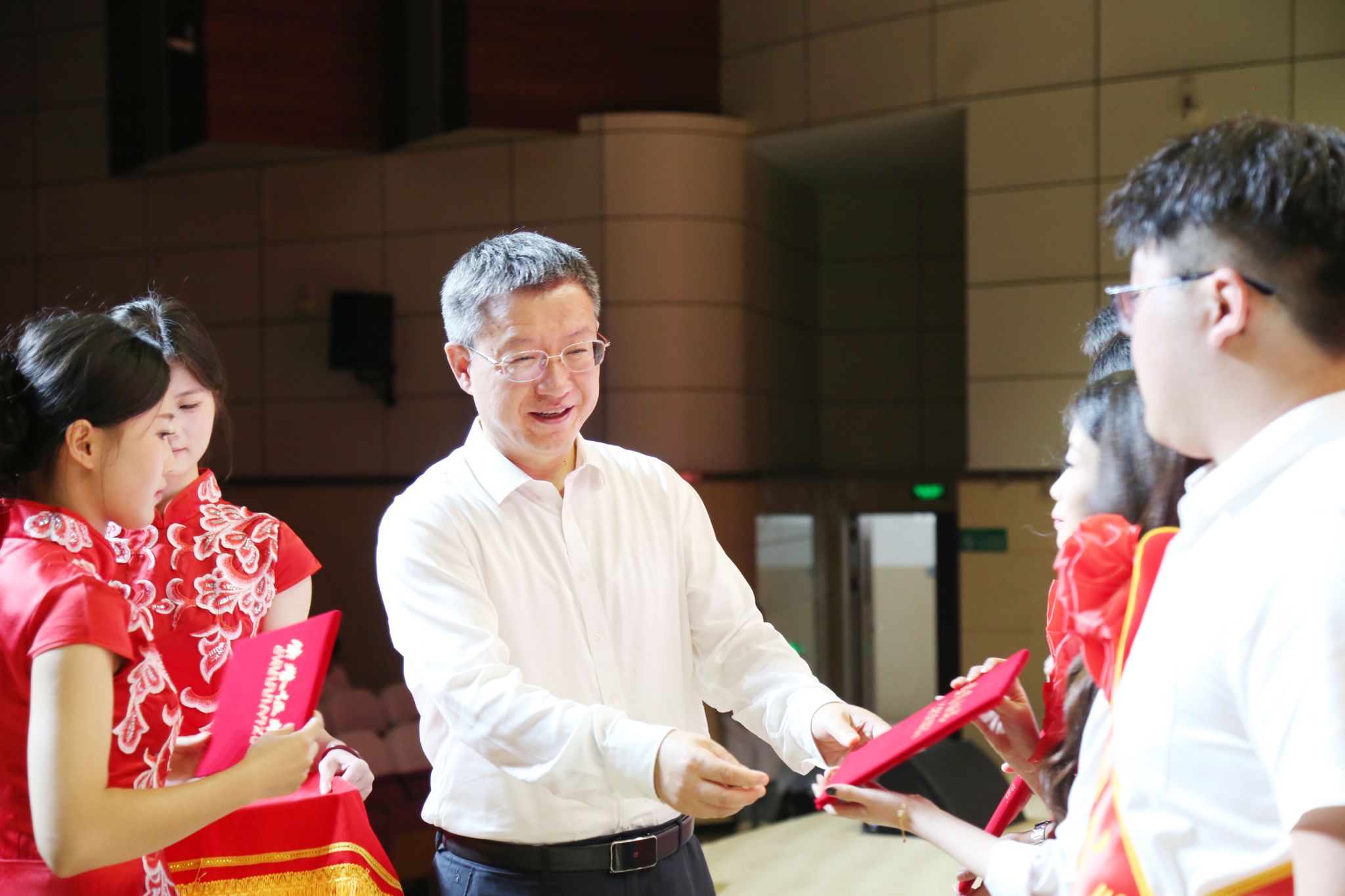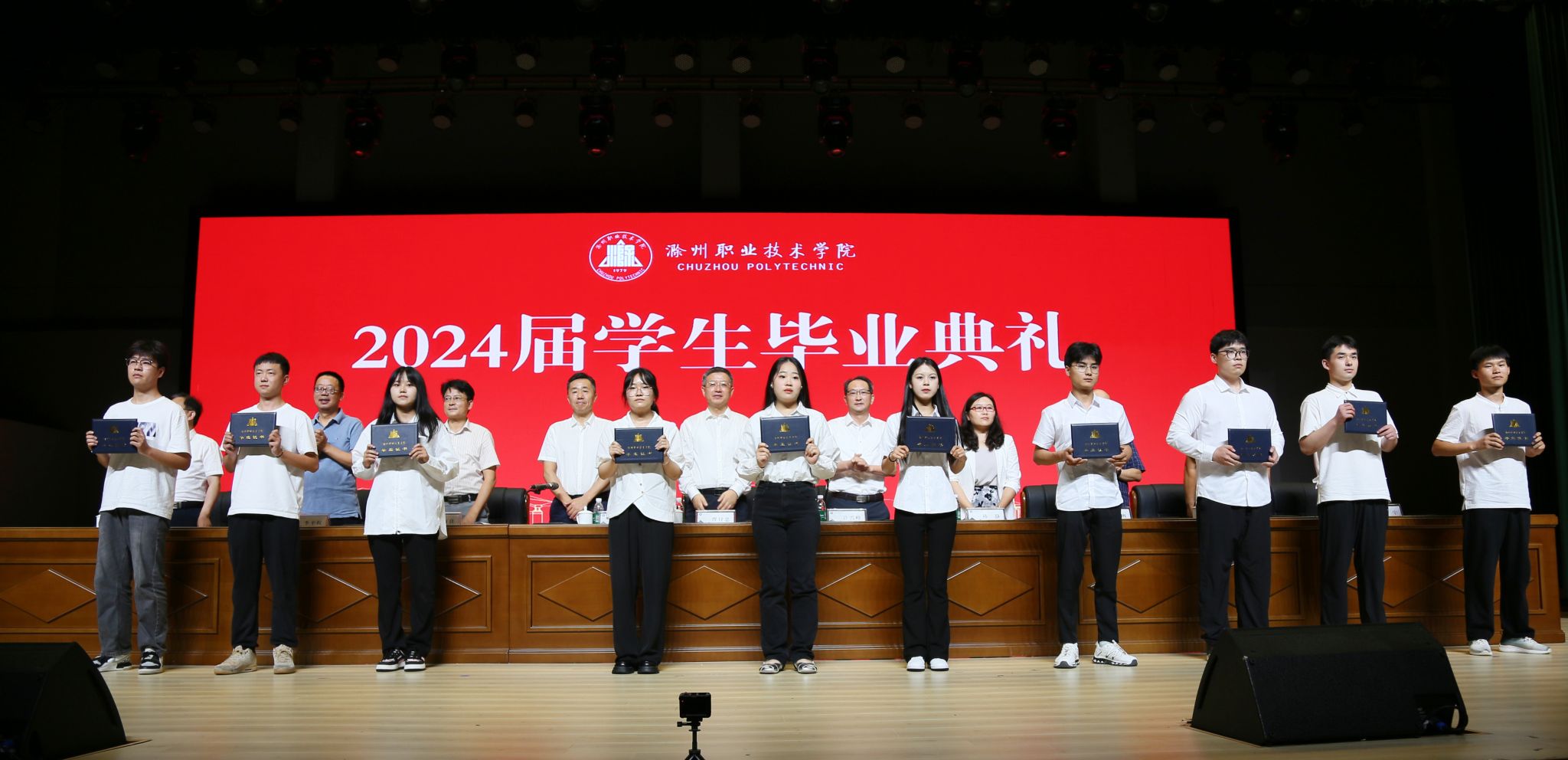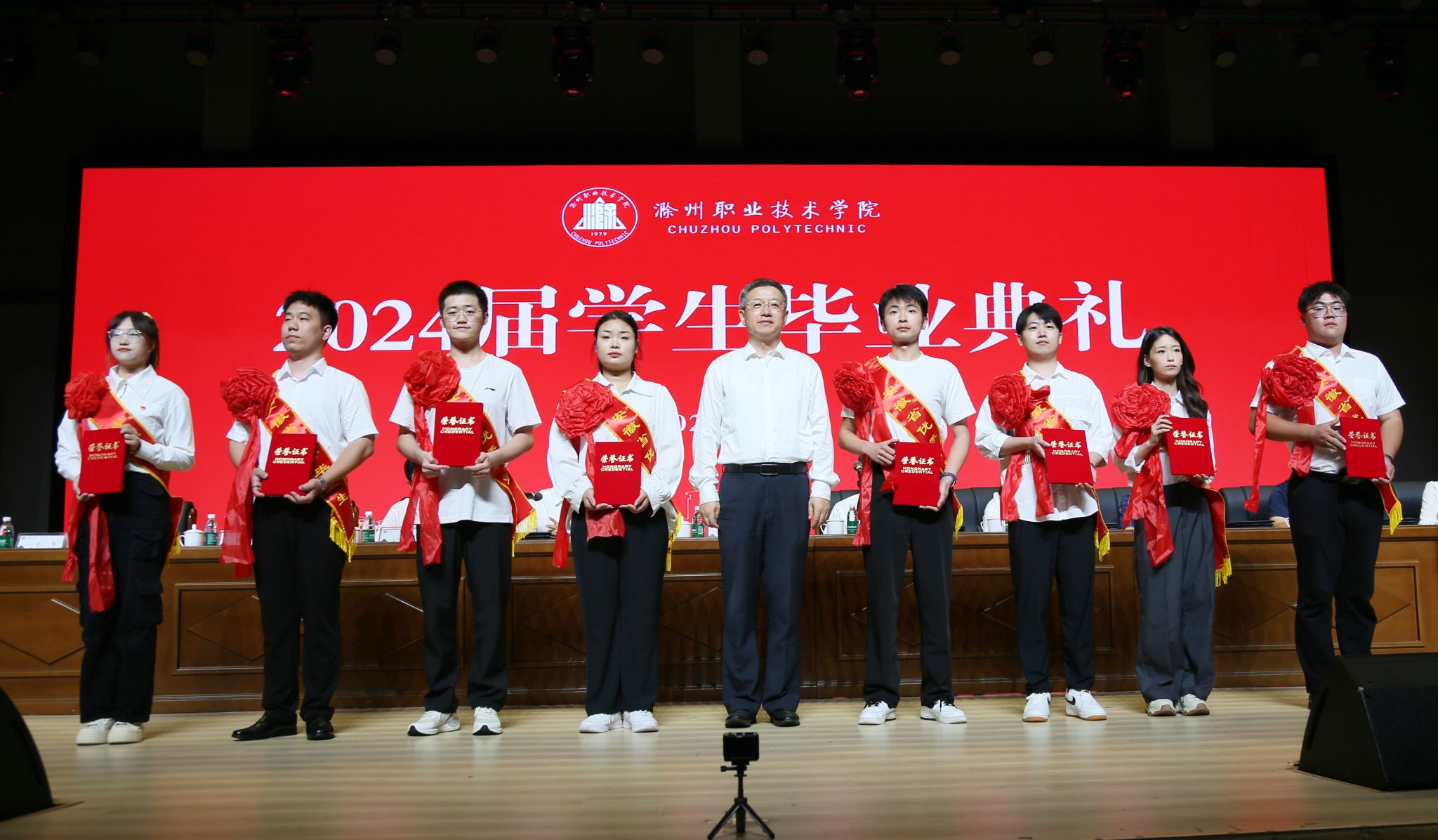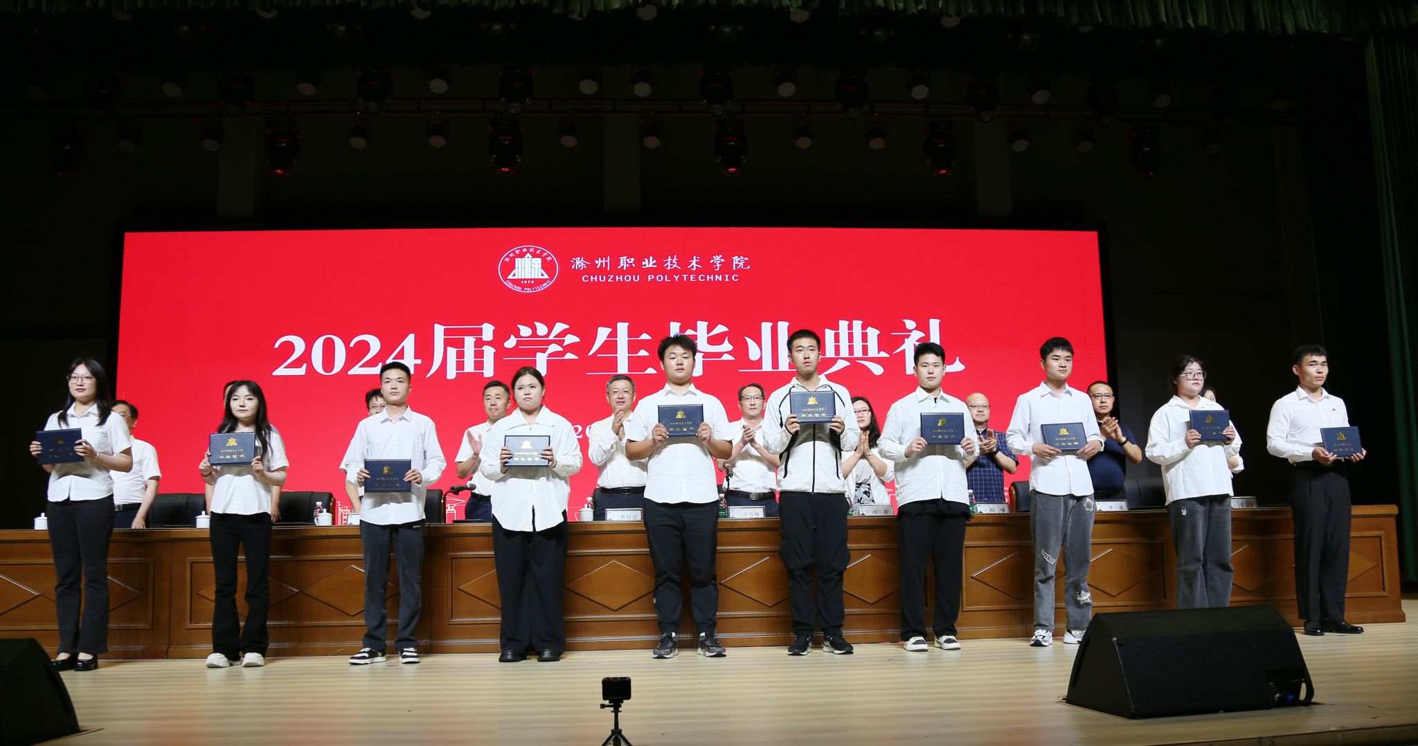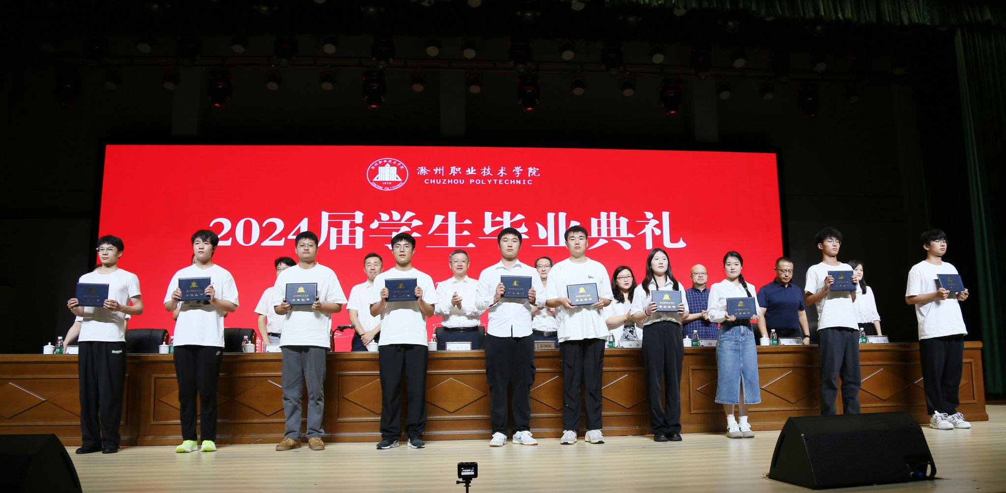 与会校领导为毕业生颁发毕业证书并合影留念。