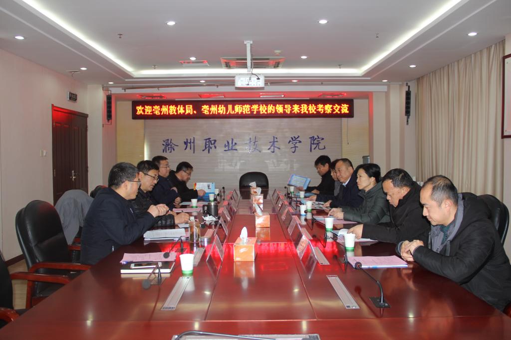 1月7日下午,亳州市教体局党组成员、总督学乔红侠,亳州幼儿师范学校党委书记、校长张伟亚一行在中航国铁教育投资管理有限公司安徽分公司的领导陪同下来beat365考察交流,校党委委员、校长助理、招生就业处处长穆松热情接待,招生就业处和交通运输学院负责人参加了会议。