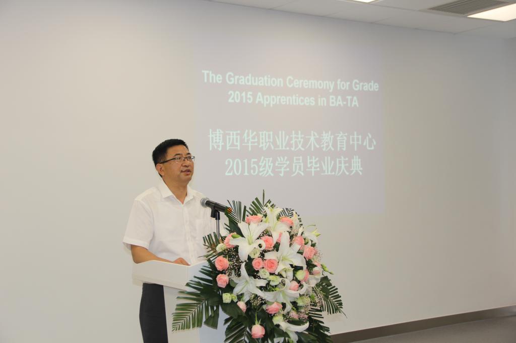 穆松对“博西华班”毕业学员表示祝贺,并提出三点期望,一是希望他们能够永远保持一颗进取之心,脚踏实地,追求卓越;二是希望他们能够时刻坚守一份责任之心,甘于奉献,勇于担当;三是希望同学们能够持久拥有一颗豁达之心,热爱生活,宽容自信。