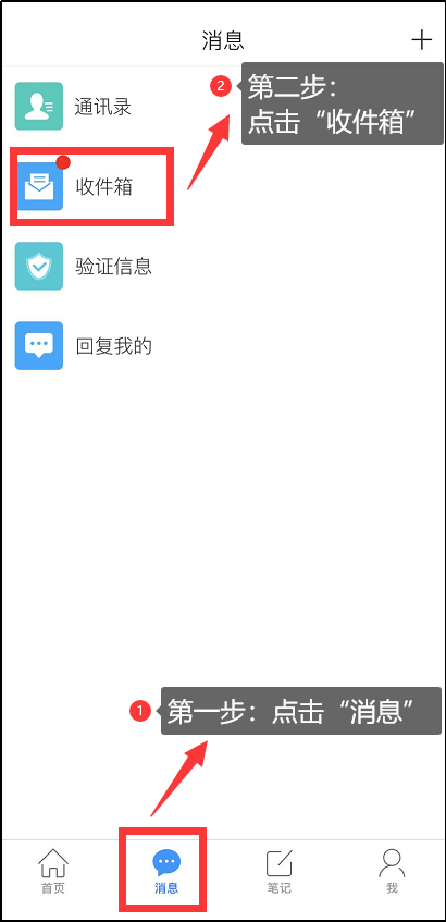 1.点击最下方“消息”,后点击“收件箱”;找到“考试通知”,点击进入;