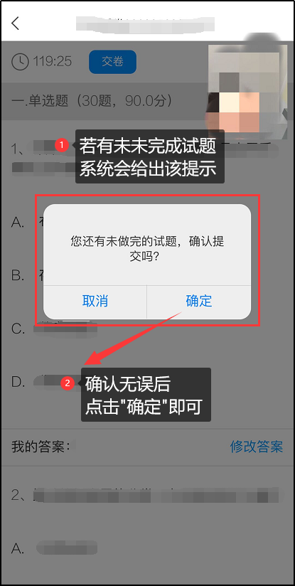 5.核查作答情况时,可修改选择答案;确认无误后,点击最上方的“交卷”按钮,并确认提交。(若存在未作答题目,系统会提示,请注意核查!)