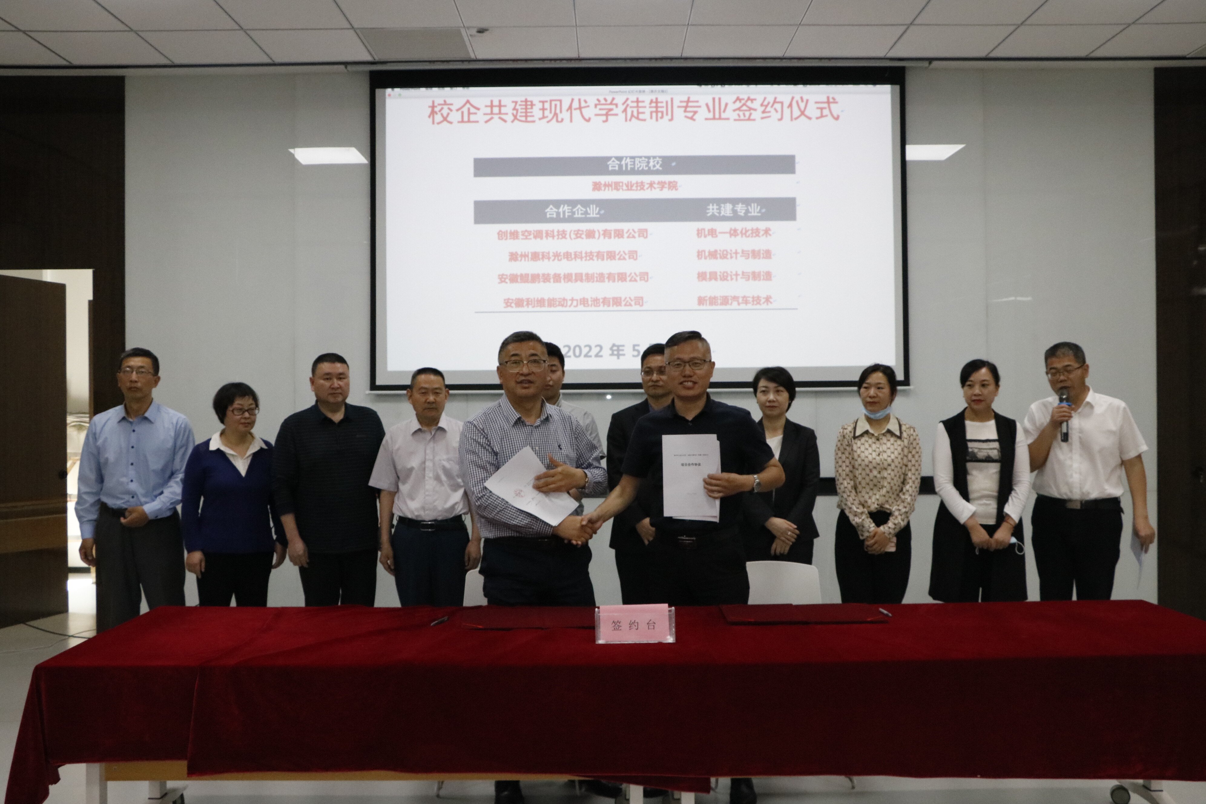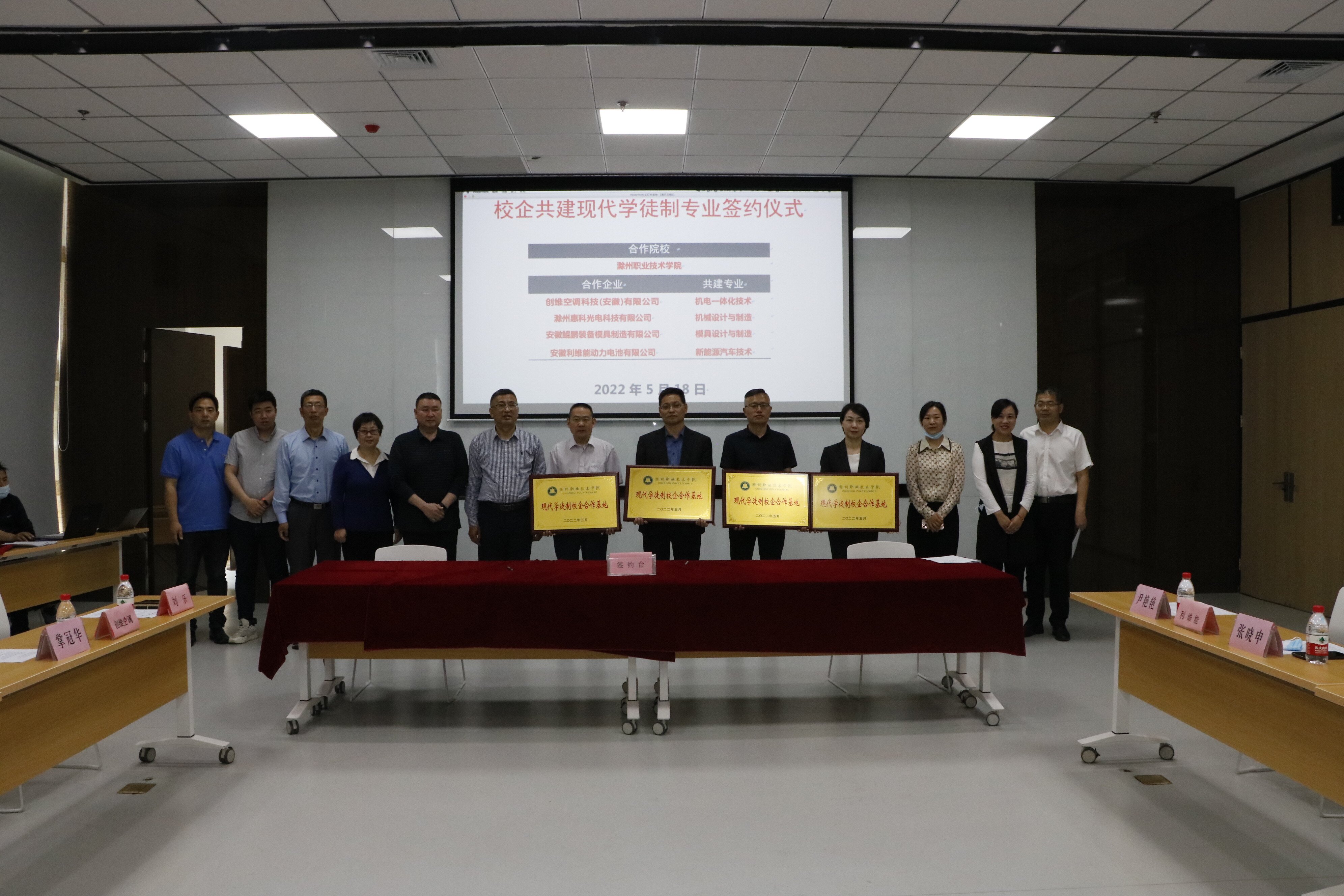 5月18日上午,beat365在创维空调科技(安徽)有限公司举行校企共建现代学徒制专业签约授牌仪式。校长助理、招生就业处处长穆松,创维公司副总经理刘乐、滁州惠科光电科技有限公司人力资源总监张海燕、安徽鲲鹏装备模具制造有限公司企管中心主任陈怀松、安徽利维能动力电池有限公司副总经理张晓申等领导出席仪式,学校教务处、招生就业处、电气工程学院、机械与汽车工程学院等相关部门负责人参加仪式。仪式由招生就业处副处长周多道主持。