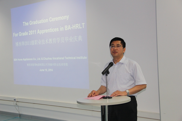 在毕业典礼上,穆松发表了热情洋溢的讲话,他首先代表学院向毕业生们表示祝贺,同时感谢博西华和社会各界多年对学院的支持。穆松指出,双方合作18年来,共培养了700多名知识过硬、实际操作能力强的技术人员,他们大多成为博西华公司的技术骨干和主机手。双方合作采用德国“双元制”教学模式,已成为省内乃至全国的典型,并受到国务院副总理刘延东同志的称赞。穆松希望毕业生为企业发展作出应有的贡献,为母校争光。