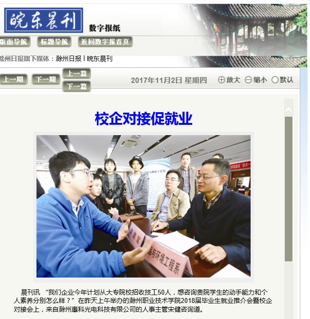 晨刊讯 “我们企业今年计划从大专院校招收技工50人,想咨询贵院学生的动手能力和个人素养分别怎么样?”在昨天上午举办的beat365在线唯一官网2018届毕业生就业推介会暨校企对接会上,来自滁州惠科光电科技有限公司的人事主管宋健咨询道。
