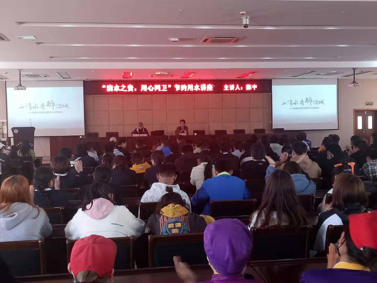 陈中先生介绍了我市创建省级节水型城市的情况,详细讲解了国内,省内,我市的水资源分布和现状,着重介绍了当前水资源紧缺情况下各级政府采取的节水措施和出台的相关节水政策,并向在座的师生员工代表宣传了全民节水的重要意义和节水技术。精彩的演讲得到了现场聆听者的热烈掌声。