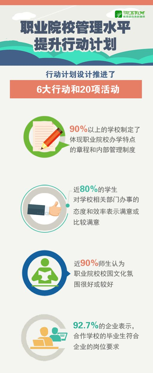 管理队伍能力不断提升。各省级行政部门将职业院校管理骨干培训纳入省、市培训计划统筹实施。调查显示,近80%的学生对学校相关部门办事的态度和效率表示满意或比较满意。