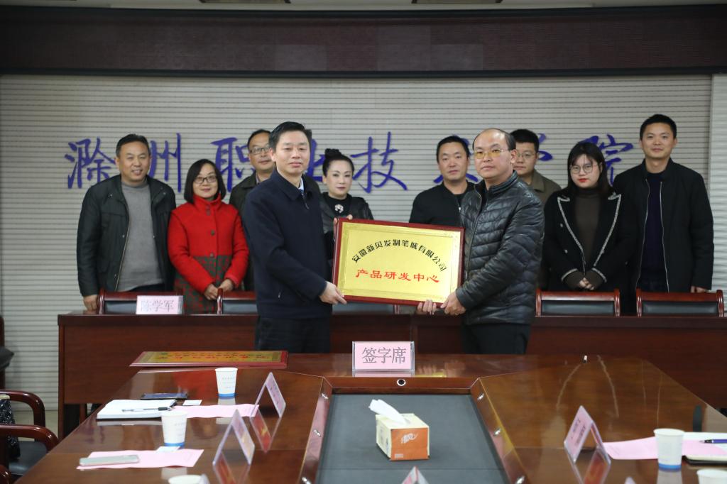 签约仪式上,传媒学院蔡忠弟老师与该公司当场签订了“办公用笔造型、结构创新设计研究”技术开发横向课题。该项目总经费为十万元,设计的产品包括:唛头笔造型设计,插套笔造型设计和揿动笔创新设计。此批设计的产品有一定的前瞻性,外观和结构方面的创新性,符合社会大众的审美需求,结构模具开发的可实现性,具有符合当代生产力的产业化前景。此外还具有绿色环保的理念,降低产品成本,能耗方面的考虑。通过该项目的开展与实施,解决安徽新贝发制笔城有限公司面临的紧迫问题,又能拓展专业教师的设计动手能力和在相关技术领域的影响力,促进校企合作与产教融合,提升了专业技术服务地方企业的水平。