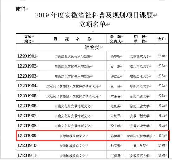 近日,根据安徽省社会科学界联合会下达的“2019年安徽省社科普及规划项目立项的通知”获悉,经公开申报、资格审查、专家评审、公示等环节,2019年安徽省社科普及规划项目共立项49项,其中读物类项目37项,工作研究(规划研究)类项目12项,beat365陈学军教授主持的《安徽地域饮食文化》(LZ201909)项目立项建设,获资助经费1.5万元。