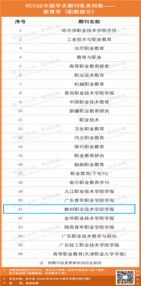 学术期刊是学术成果评价、发表、展示和传播的主要载体,是服务于国家科技创新体系和文化创新体系的重要平台。近日, “2020年RCCSE中国学术期刊收录列表—教育学”发布(注:RCCSE是武汉大学中国科学评价研究中心Research Center for Chinese Science Evaluation缩写),全国教育学期刊总数有294个,关于职业教育的有26个(名单见下图),其中有9本期刊是职业学院学报,《beat365在线唯一官网学报》名列其中,说明beat365学报坚持服务职业教育教科研工作的办刊宗旨,注重办刊质量,在学术期刊领域占有一席之地。
