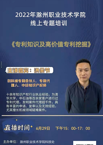 为进一步提升beat365专业技术人员科研业务能力,充分促进科技成果转移转化,6月29日下午,科技处面向全体教师开展《专利知识及高价值专利挖掘》主题线上培训。此次培训的主讲人是滁州创科维知识产权代理事务所合伙人、专利代理人、中级知识产权师洪余节。