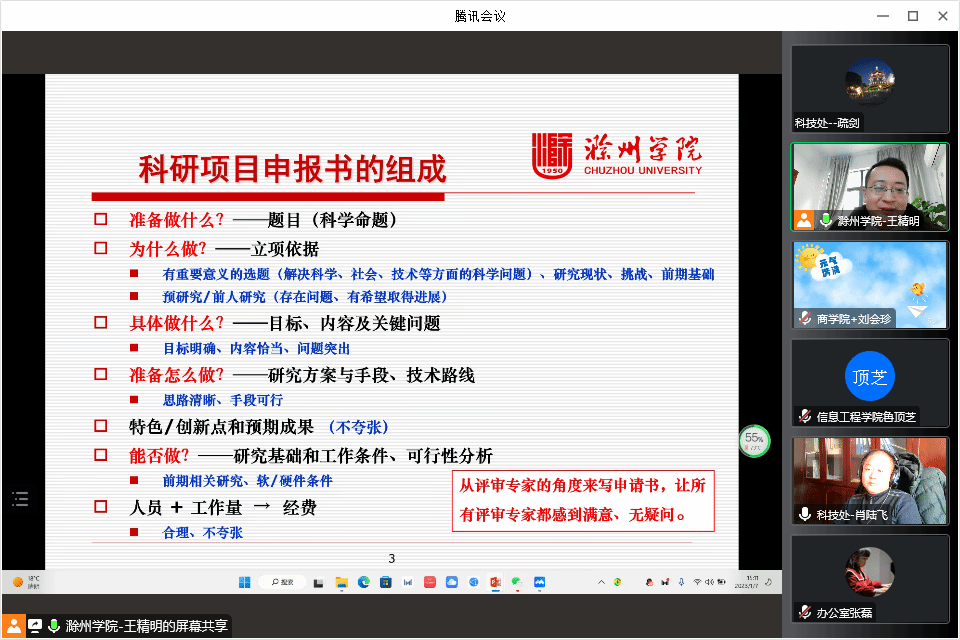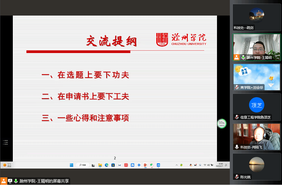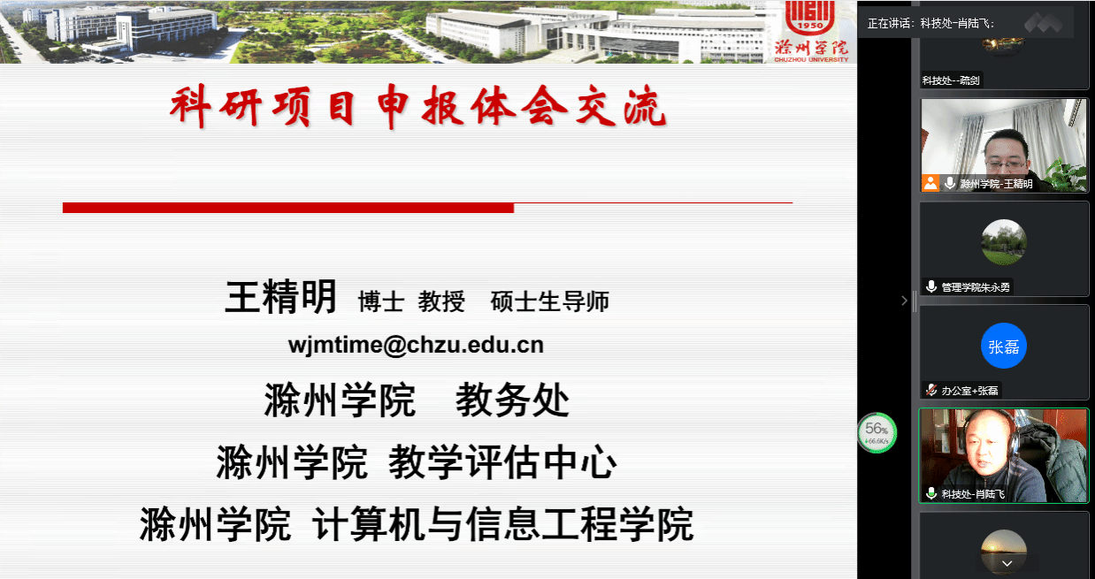 根据学校统一安排,科技处于2023年1月7日组织开展“科研项目申报体会交流”线上会议。本次培训会议由beat365科技处处长肖陆飞主持,培训邀请了滁州学院教学评估中心主任兼教务处副处长王精明教授主讲。beat365从事科研工作的教职员工参加了本次线上交流会。