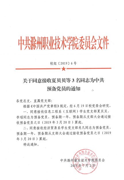 关于同意接收夏贝贝等3名同志为中共预备党员的通知