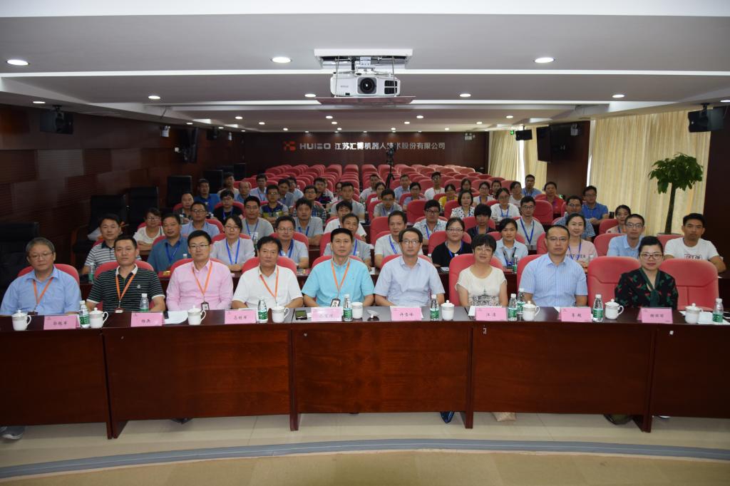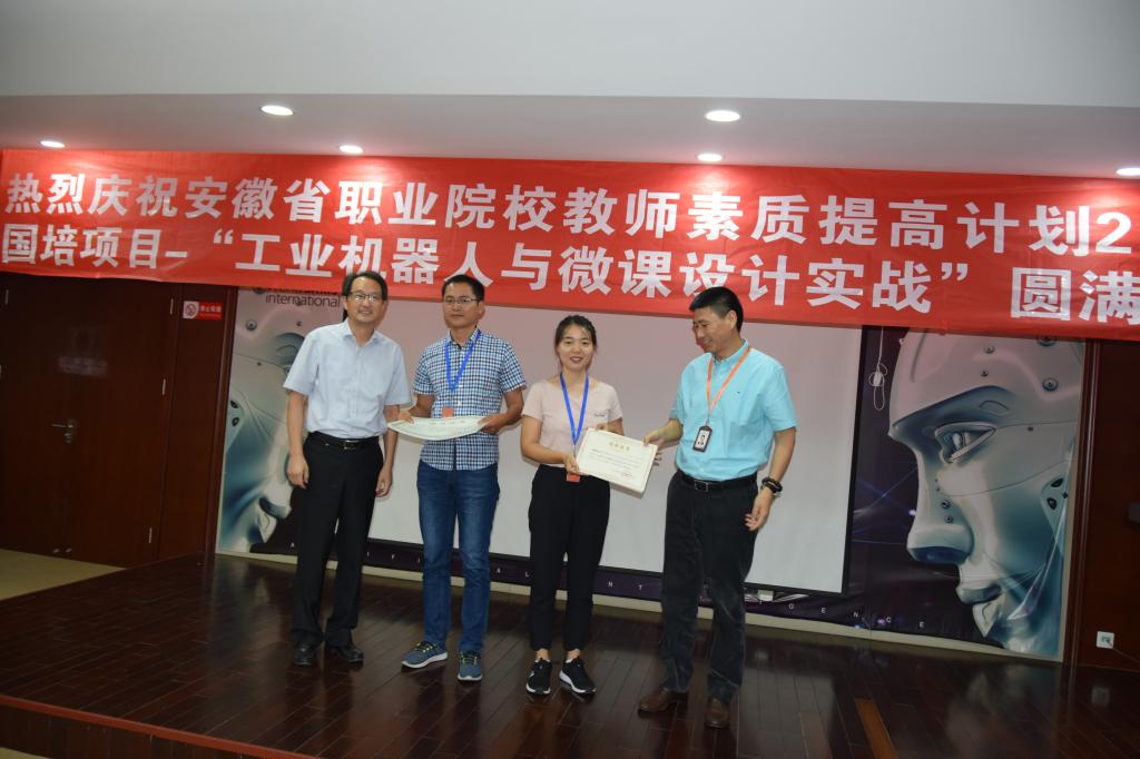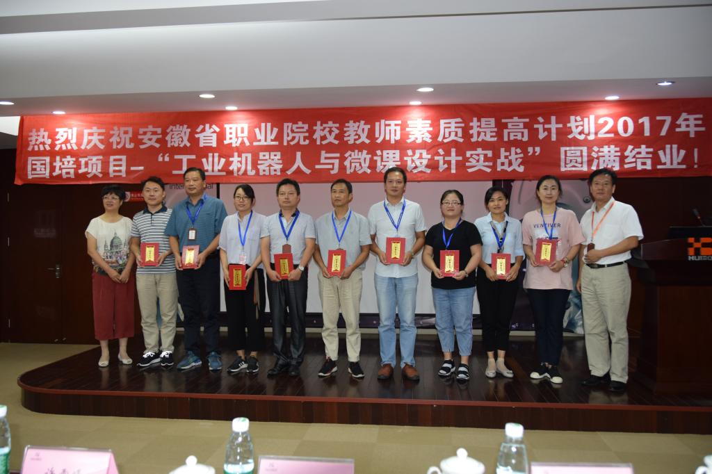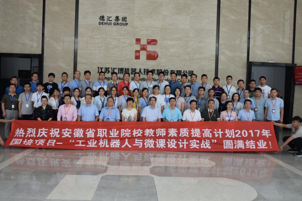 2018年8月9日上午,安徽省职业院校教师素质提高计划2017年国培项目-“工业机器人与微课设计实战”结业典礼在江苏汇博机器人技术股份有限公司如期举行,beat365在线唯一官网党委副书记、院长许雪峰、副院长江洁、组织人事处相关同志等一行前往苏州参加结业仪式。出席结业仪式的还有汇博公司董事长孔繁河、总裁助理马明军等。
