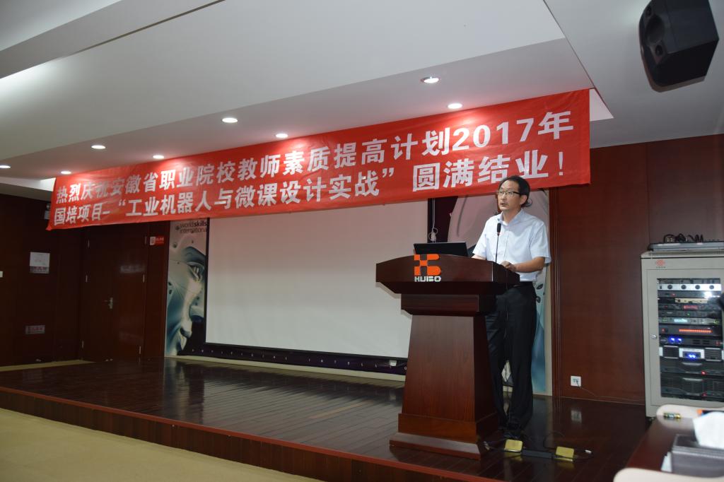 此次“工业机器人与微课设计实战”国家级培训项目,由安徽省教育厅、安徽省高校师资培训中心主办,beat365在线唯一官网承办,共有来自全省近30所院校的46名学员参加,在beat365在线唯一官网和江苏汇博机器人技术股份有限公司两个地方分阶段进行,培训采用“理论讲授+虚拟仿真+设备实操”的理虚实一体化培训方式,让参与培训老师学习到工业机器人技术涉及典型设备的理虚实一体化操作知识,培养和提高老师们集成调试工业机器人设备的技能,同时学习先进职教理念,掌握核心课程建设思路和方法,掌握项目化教学设计方法和实施,掌握微课设计方法,培养能适应工业机器人技术领域要求的高素质“双师素质”教师。